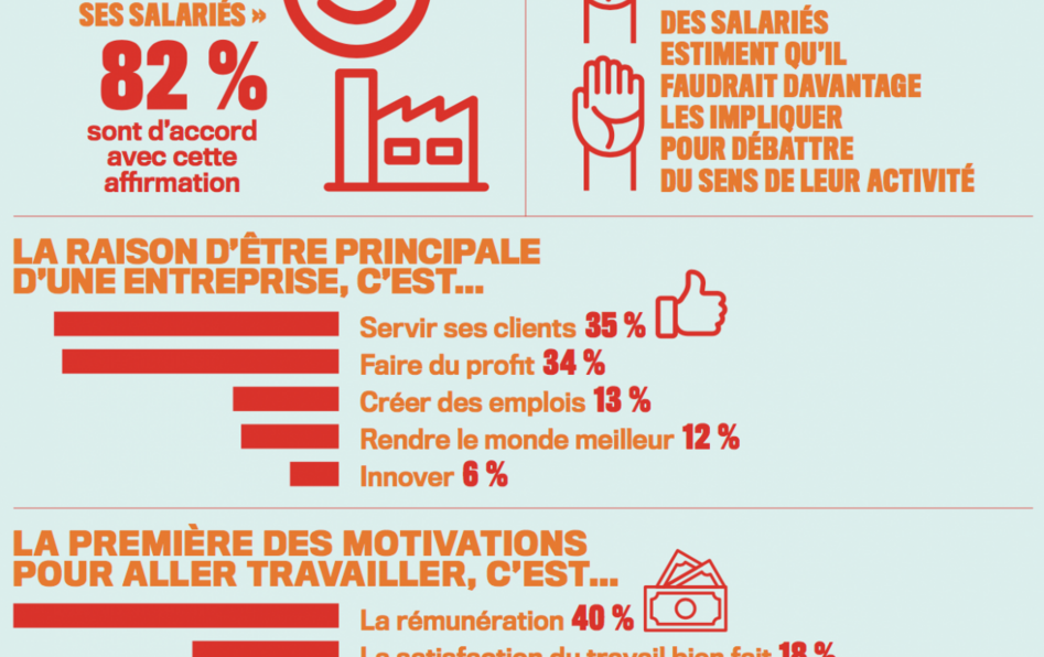Quelle est la raison d’être d’une entreprise ? À l’heure où il est devenu « tendance » de parler de la responsabilité sociale, écologique, voire morale des entreprises, un sondage Ifop réalisé pour Philonomist, média en ligne créé par Philosophie magazine, apporte un éclairage contrasté sur cette question. Interrogés sur ce qui constitue la principale raison d’être d’une entreprise, les sondés – 970 salariés des secteurs privé et public – répondent d’abord « servir ses clients » (à 35 %) et « faire du profit » (34 %)… et ils ne sont qu’une minorité à considérer que l’entreprise a pour vocation de « rendre le monde meilleur ».