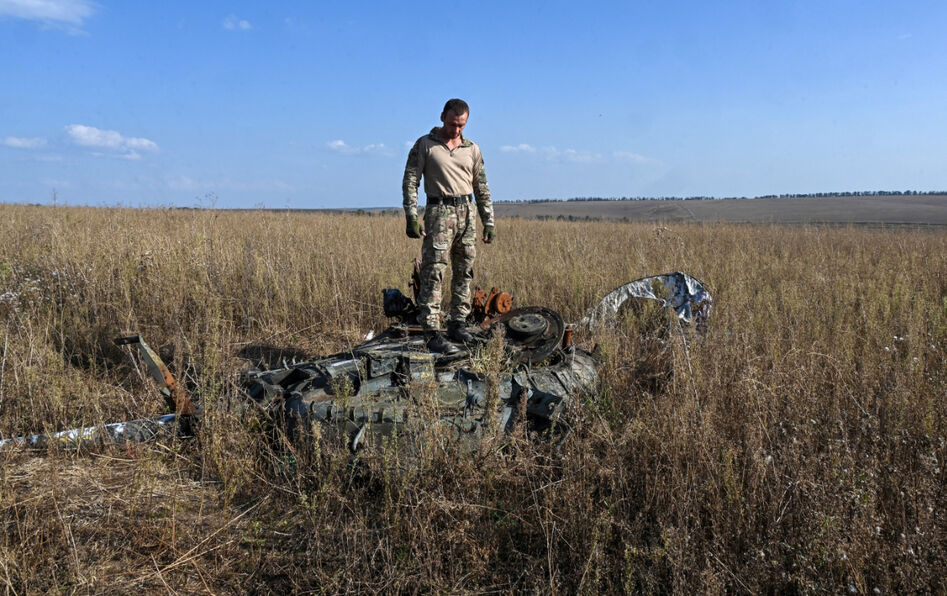 Le volontaire Jan Artyukhov inspecte un char russe détruit dans un champ près de la ville de Derhachi, dans la région de Kharkiv (Ukraine), le 1er octobre 2023. © Sergey Bobok/AFP
