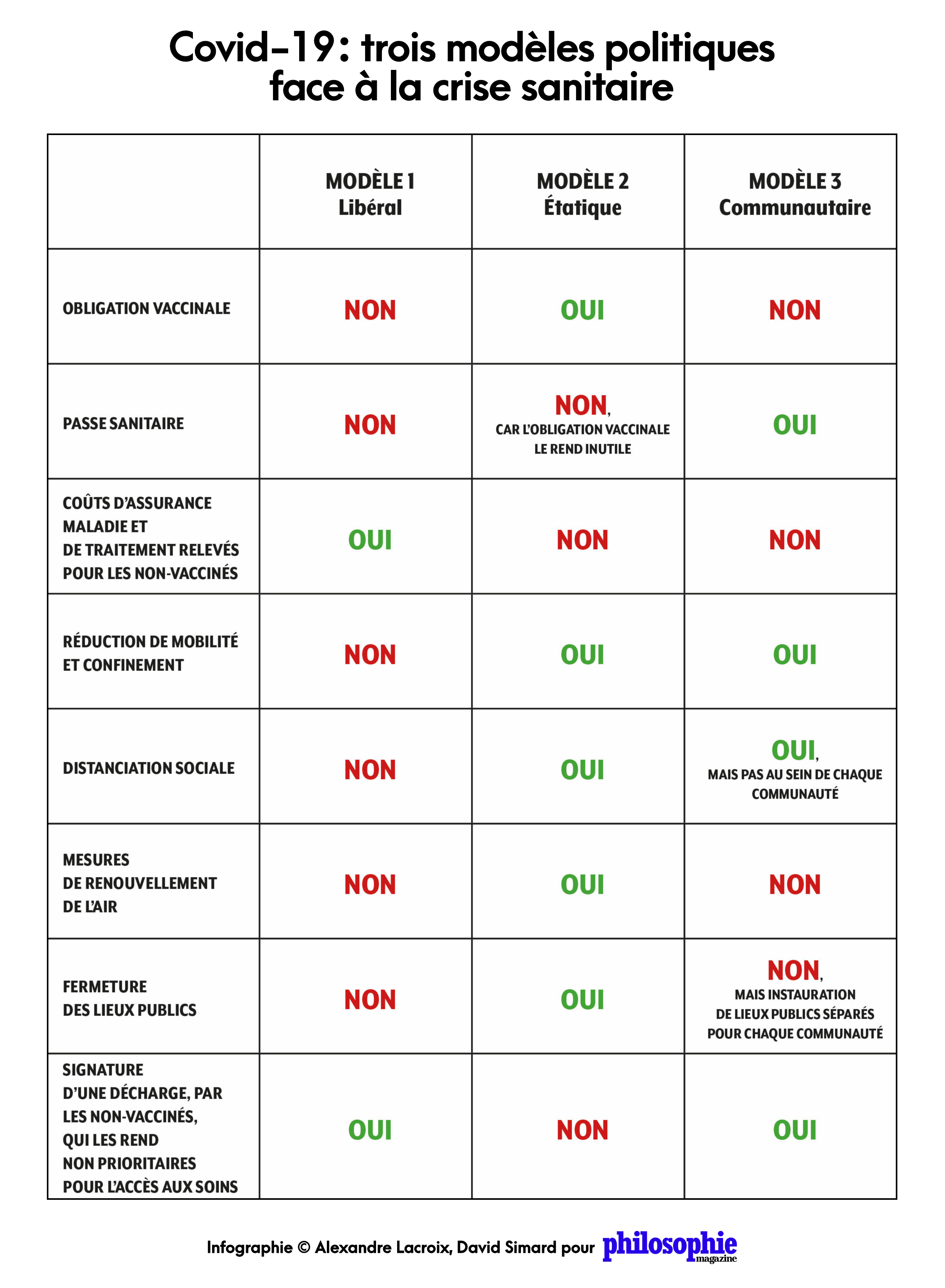 Alors que le passe sanitaire est contesté par une partie non négligeable de la population, nous nous sommes demandé si d’autres politiques étaient possibles face au Covid-19. Voici, imaginés avec la complicité du spécialiste de philosophie de la médecine David Simard, trois modèles politiques de réponses possibles à l’épidémie.