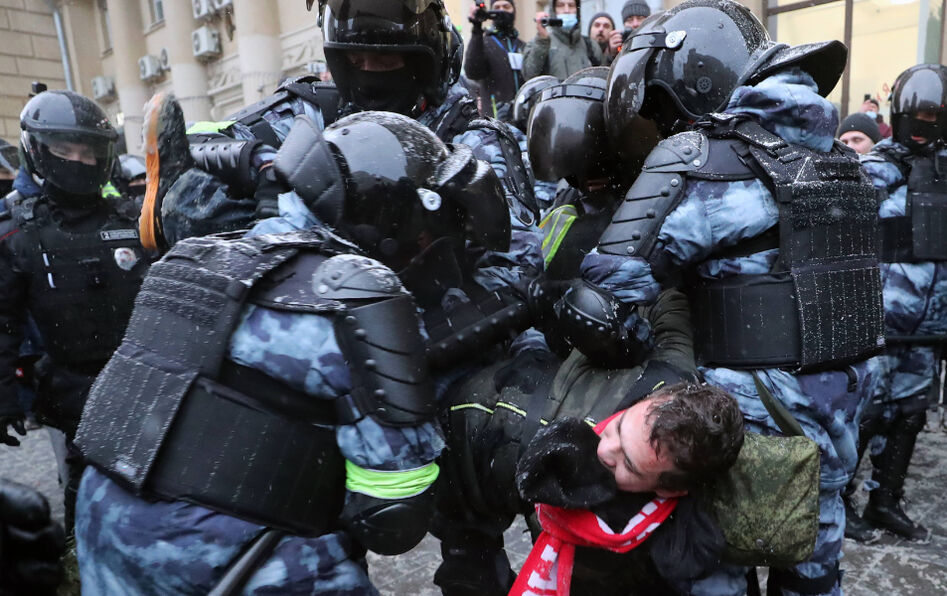 Centre-ville de Moscou (Russie), le 30 janvier 2021 : une unité de policiers anti-émeutes immobilise un manifestant, pour participation à un rassemblement de soutien à l’opposant Alexeï Navalny jugé illégal par le Kremlin. © Sergei Savostyanov/TASS/Sipa